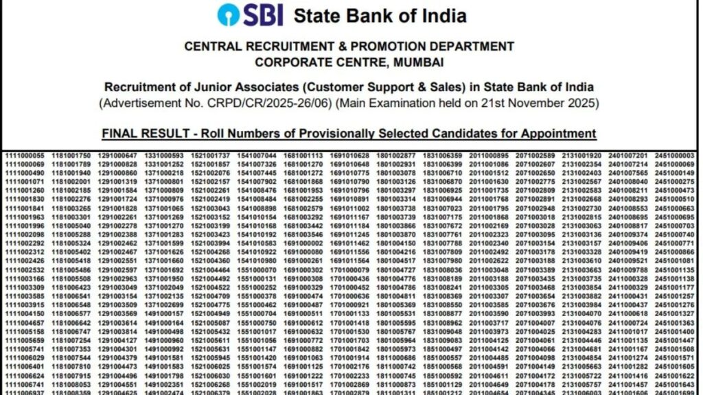 SBI Clerk Mains result 2025 का रिजल्ट घो…